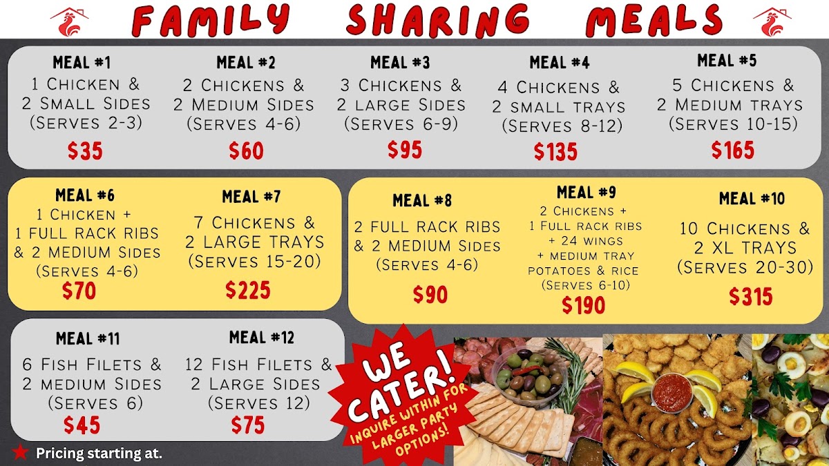 2chickens 2 medium sides (pot, rice, FHG, fries) 4 shrimp patties 4 tarts